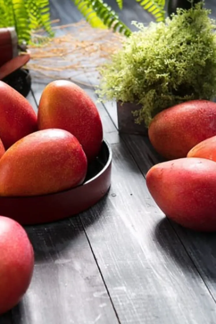 果皮顏色及形狀: 愛文芒果成熟後果皮呈現鮮紅色,外觀飽滿圓潤,有時會像蘋果一樣紅潤,因此又被稱為「蘋果檨」.